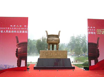 2007年10月13日,北京奧運(yùn)會倒計(jì)時(shí)300天,北京朝陽公園里彩旗飄飄,彩球高懸,到處洋溢著歡慶的氣氛。上午10時(shí),由國家文化產(chǎn)業(yè)示范基地山西宇達(dá)集團(tuán)精心鑄造、甘肅省人民政府贈送給北京奧組委的青銅《奧運(yùn)盛鼎》在這里舉行隆重的捐贈揭幕儀式。著名歌唱家郭蓉的一曲《紅旗飄飄》把整個活動推向高潮。北京奧組委執(zhí)行副主席蔣效愚,甘肅省副省長馮健身以及300名大學(xué)生奧運(yùn)志愿者和千余名熱心中外觀眾參加了揭幕慶典。北京奧組委執(zhí)行副主席蔣效愚在致辭中說,《奧運(yùn)盛鼎》的捐贈活動有益于彰顯中華民族燦爛文化,弘揚(yáng)奧林匹克精神,展示中國改革開放、國泰民安的良好形象,表達(dá)了全國各族人民關(guān)心、支持北京奧運(yùn)會的美好心愿?!秺W運(yùn)盛鼎》將臨時(shí)安放在朝陽公園西門內(nèi)的霧泉廣場,奧運(yùn)會開幕前將遷至奧林匹克中心區(qū),成為區(qū)中的獨(dú)特景觀。中央電視臺等各大媒體紛紛報(bào)道……巍巍青銅重器,見證著中華百年奧運(yùn)夢圓,也見證著華夏兒女對百年奧運(yùn)的熱切期盼。這一堪稱經(jīng)典的2008奧運(yùn)會主題青銅禮器震撼著人們的心。