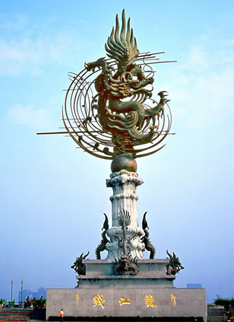 2007年6月19日,高達(dá)48米的青銅巨雕《錢江龍》在杭州錢塘江畔落成揭幕。各大媒體紛紛報(bào)道稱,這是目前國內(nèi)最高的巨龍雕塑,是杭城濱江區(qū)標(biāo)志性城市景觀。而這座巨雕也僅僅是射潮廣場巨型群雕《錢王射潮》的一個(gè)組成部分,卻也讓人感受到杭州的氣度和胸懷,精神和風(fēng)采。