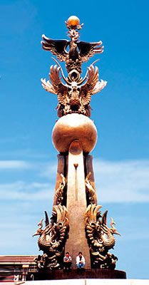 2000年春節(jié)前,蕪湖市委、市政府為了加快跨世紀(jì)大開放的力度,同時(shí)為提供給市民一個(gè)文化、休閑的優(yōu)美生活空間,決定在原市政府舊址、市中心美麗的鏡湖邊建設(shè)一座大型城市中心廣場,終審?fù)ㄟ^的廣場設(shè)計(jì)方案中有一尊象征蕪湖城市形象、反映歷史文化的主題雕塑,設(shè)計(jì)高度為28米,蕪湖的決策者們一致把設(shè)計(jì)雕塑的最佳人選定格在當(dāng)今著名藝術(shù)家韓美林先生身上。這位被國際友人譽(yù)為"中國畢加索"的藝術(shù)家,人們都熟悉他的惟妙惟肖的動物畫,更多是從每年國家郵政部門發(fā)行的賀年卡上,從電視、報(bào)紙、雜志的媒體上,從每次轟動全國的個(gè)人藝術(shù)展上看到他在繪畫、陶藝、布藝、書法、設(shè)計(jì)等藝術(shù)領(lǐng)域的佳作,知道他豐碩的藝術(shù)成就。他設(shè)計(jì)的中國國際航空公司飛機(jī)機(jī)翼上的鳳凰標(biāo)志幾乎飛遍了全世界浩翰的天空,他參與創(chuàng)作的北京申奧標(biāo)志掛滿了首都紫禁城,他為亞特蘭大奧運(yùn)會設(shè)計(jì)的高9米的"五龍鐘塔"紀(jì)念雕塑永久矗立在美國的土地上,他設(shè)計(jì)的深圳龍崗廣場高達(dá)25米的"祥瑞福輳"青銅雕塑被譽(yù)為"偉大的藝術(shù)工程",他設(shè)計(jì)創(chuàng)作的大連老虎灘的"群虎"巨型石雕長達(dá)42米,重達(dá)4800噸,他的雕塑、畫作三十余次被黨和國家領(lǐng)導(dǎo)人作為出國訪問的國禮饋贈給外國政要......