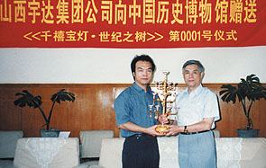 1999年8月3日,中國(guó)歷史博物館貴賓接待室。山西宇達(dá)集團(tuán)公司向中國(guó)歷史博物館捐贈(zèng)世紀(jì)之交高級(jí)藝術(shù)傳世珍品《千禧寶燈 世紀(jì)之樹》儀式正在這里舉行,中國(guó)歷史博物館副館長(zhǎng)孔祥星先生從宇達(dá)集團(tuán)總經(jīng)理衛(wèi)恩科手中接過金光燦燦的珍品時(shí),在場(chǎng)的數(shù)