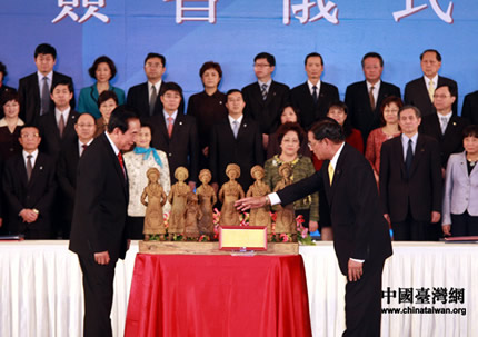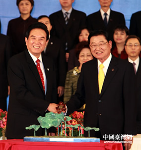 2010年12月21日下午,海協(xié)會會長陳云林與?;鶗麻L江丙坤正式簽署《海峽兩岸醫(yī)藥衛(wèi)生合作協(xié)議》,雙方并在協(xié)議簽署后互贈禮品。圖為海基會致贈海協(xié)會方面的陶土作品《齊心傳唱 和諧天籟》。 兩岸兩會領(lǐng)導人第六次會談21日在臺北舉行,海協(xié)會會長陳云林和?;鶗麻L江丙坤于當天下午正式簽署《海峽兩岸醫(yī)藥衛(wèi)生合作協(xié)議》。協(xié)議簽署后,雙方互贈紀念品。 ?;鶗沦浐f(xié)會方面的禮品是名為《齊心傳唱 和諧天籟》的一組陶土雕塑作品。海協(xié)會回贈?;鶗矫娴氖且蛔鹕徎ㄔ煨偷袼堋逗檬逻B連》,寄托對兩岸關(guān)系和平發(fā)展的款款美意。(特派記者 李徽) (來源:中國臺灣網(wǎng)) | |