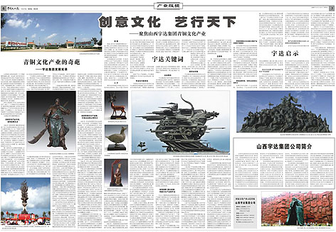 中國文化報2008年11月14日在六、七兩版的《產(chǎn)業(yè)縱橫》大篇幅以《創(chuàng)意文化·藝行天下》為題強(qiáng)勢報道宇達(dá)青銅文化產(chǎn)業(yè)引起巨大反響,文中分為"宇達(dá)關(guān)鍵詞"、"宇達(dá)啟示"、"宇達(dá)發(fā)展實錄"三大版塊深入剖析了宇達(dá)的發(fā)展、戰(zhàn)略、思路等;該文由山西省委宣傳部研究室謝振中撰寫。