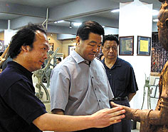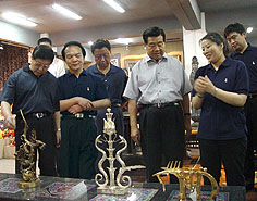 2004年6月7日,全國(guó)政協(xié)主席賈慶林、副主席王忠禹在北京韓美林工作室專程參觀了宇達(dá)制作的青銅雕塑和青銅禮品,并聽取了衛(wèi)恩科總經(jīng)理長(zhǎng)達(dá)三個(gè)小時(shí)的宇達(dá)青銅雕塑和青銅禮品的詳細(xì)介紹。賈慶林主席對(duì)宇達(dá)的青銅雕塑和青銅禮品給予高度評(píng)價(jià),并對(duì)衛(wèi)總提出,希望宇達(dá)能進(jìn)一步拓展中國(guó)的青銅旅游商品市場(chǎng)的殷切希望。 | |